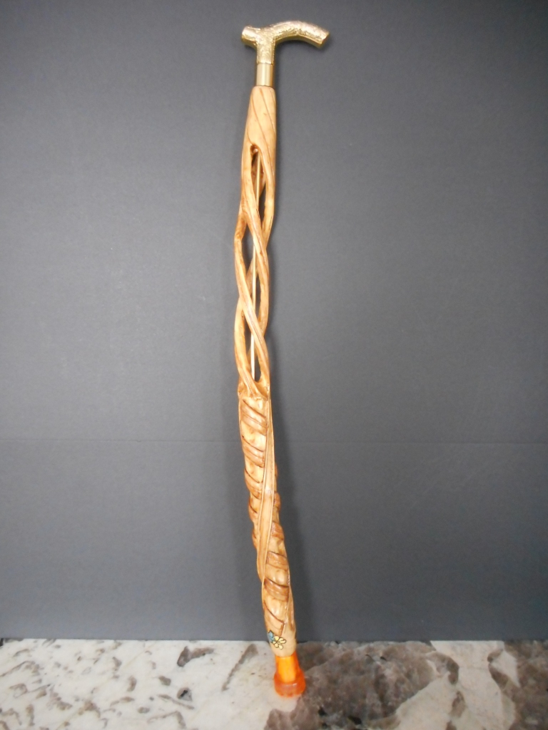 This stick represents one of the most technically demanding techniques in walking stick carving: the open spiral, sometimes called lattice or cage carving. Rather than decorating the surface of the shaft, the carver has removed material from the interior, cutting through the wood to create a series of interlocking helical strands that twist around a hollow centre. The result is a shaft that is simultaneously structural and skeletal — strong enough to bear weight yet visually open, the eye passing straight through the wood from one side to the other.