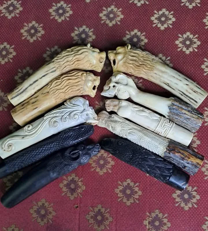The bottom row introduces a different aesthetic entirely. The fan of pale handle blanks laid on a patterned textile shows the raw material of the craft — each piece a carved but unfinished form, some recognisably animal, others still ambiguous, all demonstrating the intermediate stage between roughed-out shape and finished sculpture. The four-image panel of horse-head crook handles at different stages and angles is a study in how the same subject can be interpreted at varying levels of detail: from a suggestion of a muzzle and ear to a fully resolved portrait with individual hair texture carved into the forelock. The final image — a ram’s-horn handle held in the hand — closes the collection with the most ergonomic form of all: the natural spiral of the horn itself, which requires almost no modification to become a grip, and whose form has guided shepherds’ staffs for thousands of years.
