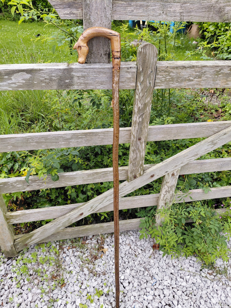 The handle is where the maker’s hand is most visible. Carved in the round at the top of a natural crook, an animal head — most likely a horse or a hound, the snout slightly elongated and the brow gently furrowed — sits at the curve of the grip. The carving is not highly detailed but it does not need to be: the silhouette is clear and confident, and the form follows the natural arc of the wood so organically that it is difficult to tell where the branch ends and the sculpture begins. A few turns of cord or wire wrap the neck of the figure just below the head, both reinforcing the join and adding a practical detail that suits the working character of the piece.