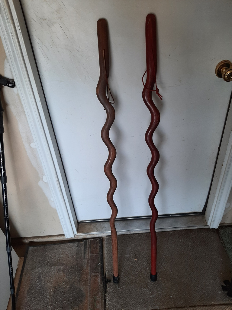 These two sticks share the same fundamental idea executed in the same wood species — both are turned from what appears to be red cedar or a similarly reddish-hardwood — yet side by side they reveal how much variation exists within a single concept.