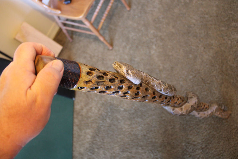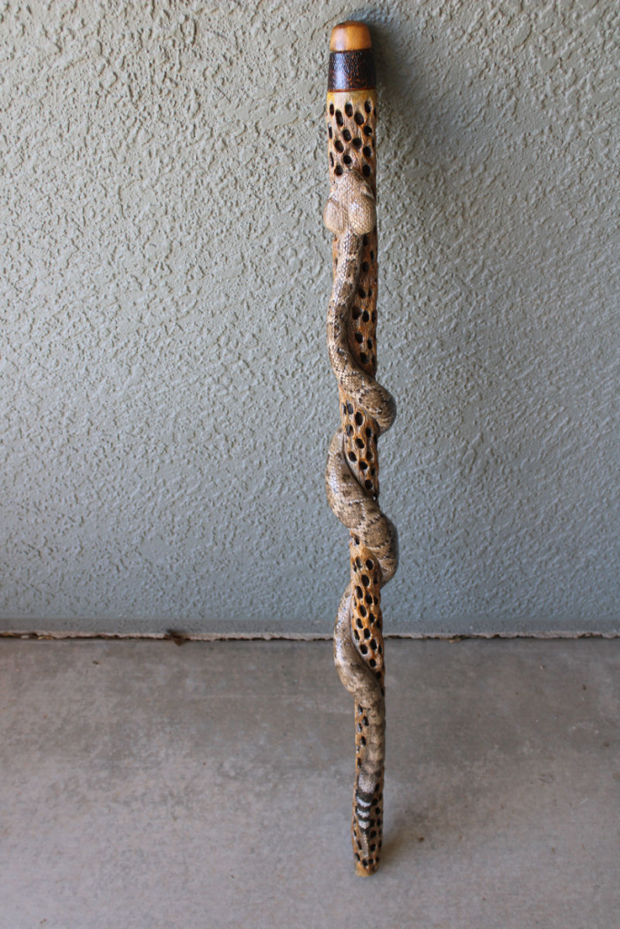 The right stick is the boldest of the three. A snake winds continuously from tip to handle in high relief, its body rendered with repeating scale texture carved into the wood and finished in warm tan and brown tones. The serpent is thick and muscular in appearance, dominating the shaft completely — there is no competing element, just the single creature and the wood it grips.