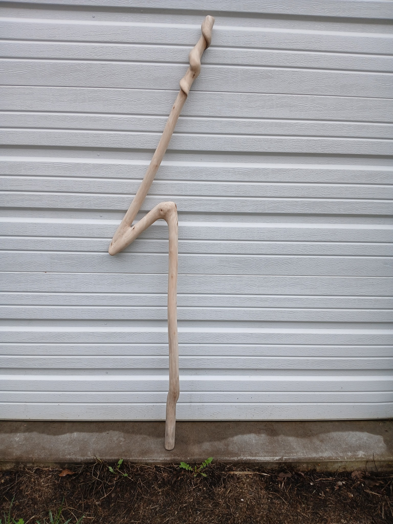 This stick has barely been touched by a tool, and that restraint is precisely the point. The shaft retains its full bark — a rich, multi-toned surface of amber, rust, and deep brown that has cracked and furrowed naturally as the wood dried, creating a texture no carving knife could convincingly replicate. Running the entire length of the stick is a pronounced natural spiral twist, the legacy of a climbing vine that coiled around the growing branch for years and left its signature permanently written into the wood’s structure.