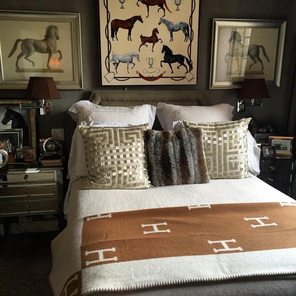 The bed is dressed in crisp white linens, metallic accent pillows, and a signature Hermes throw, blending comfort with luxury. Mirrored nightstands, soft lighting, and tasteful decor pieces add polish and depth, while subtle equestrian motifs tie the look together. It’s a perfect example of timeless masculine elegance rooted in classic style and craftsmanship.