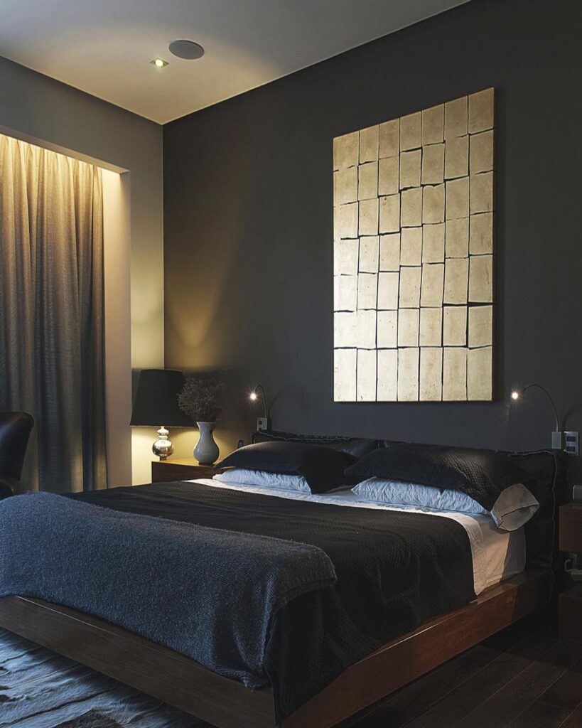 This bedroom strikes the perfect balance between darkness and sophistication. Deep gray walls and dark wood flooring set a moody foundation, while the soft, layered bedding in black and slate tones enhances the masculine appeal. The standout feature is the large geometric gold wall art, which adds warmth and contrast to the subdued palette.