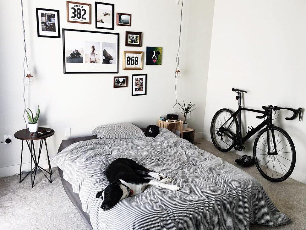 Practical touches like the hanging pendant lights, small bedside tables, and neatly mounted bicycle make the space functional without clutter. The use of black accents — from the bike frame to the table legs — ties everything together, giving this minimalist room a clean, cohesive edge that feels both casual and refined.