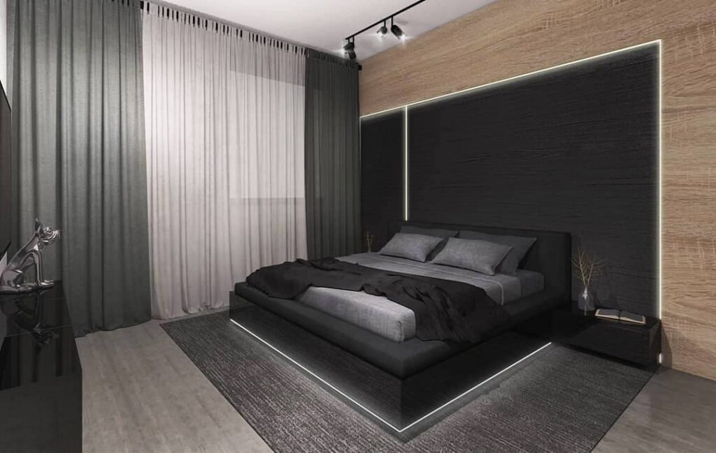 This bedroom showcases a sleek, high-end aesthetic that feels both modern and futuristic. The dominant tones of charcoal gray and soft wood create a balanced contrast, while the illuminated lines framing the headboard and bed base add a striking, architectural element. Every detail — from the minimal decor to the layered curtains in gray and white — enhances the room’s sense of symmetry and calm.