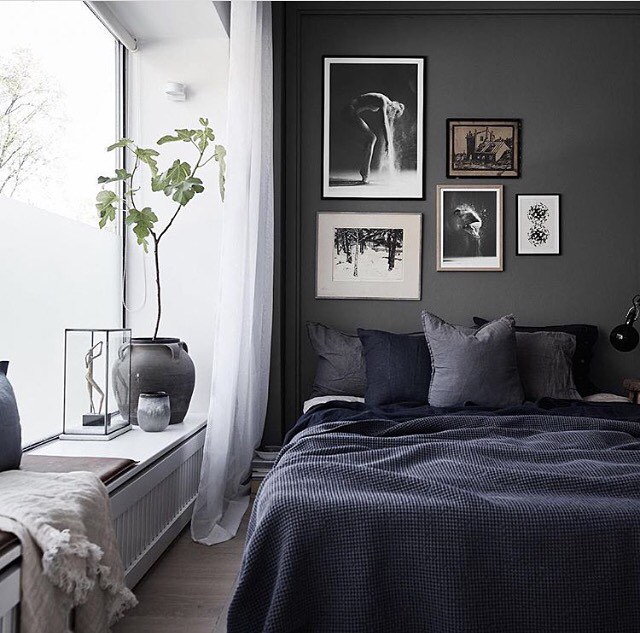 This dark-toned men’s bedroom perfectly embodies modern minimalism. The walls are painted a deep charcoal gray, creating a moody yet elegant backdrop for the bed dressed in navy blue bedding and layered gray pillows. A curated gallery wall of black-and-white art adds sophistication and a personal touch, while a large window lets in soft natural light that balances the darker palette.