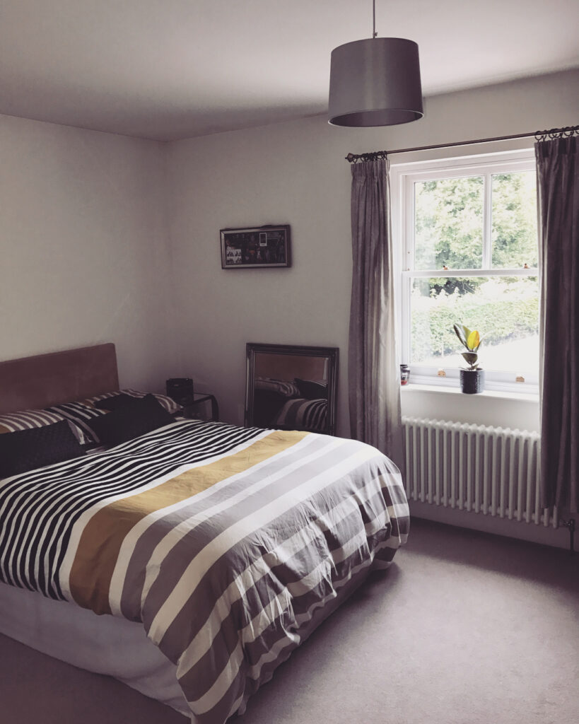 This bedroom embraces a clean and understated design, perfect for those who prefer a straightforward yet stylish aesthetic. The striped bedding in shades of black, gray, and mustard adds a subtle pop of color to the otherwise neutral palette, bringing energy to the calm setting. Natural light from the large window enhances the room’s warmth, highlighting the simplicity of the décor.