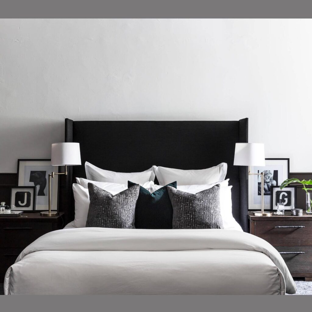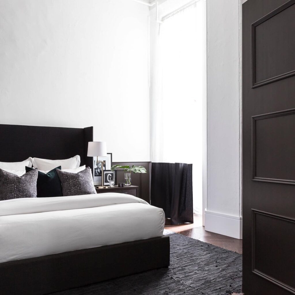 This bedroom embraces the power of simplicity through a refined black-and-white palette. The clean white walls and bedding create an airy sense of space, while the black bed frame, door, and textured rug introduce striking contrast and depth. Layered pillows in charcoal and patterned fabrics add subtle luxury without overwhelming the minimalist theme.