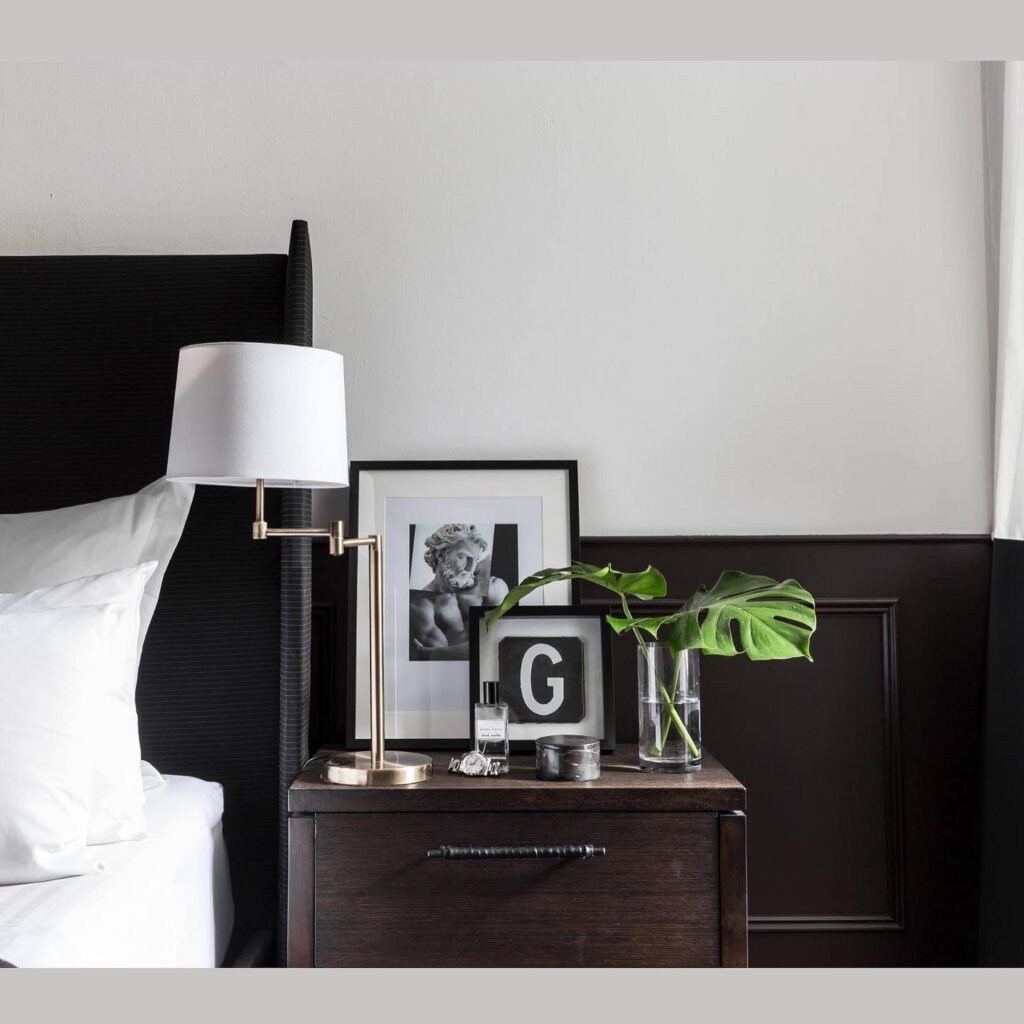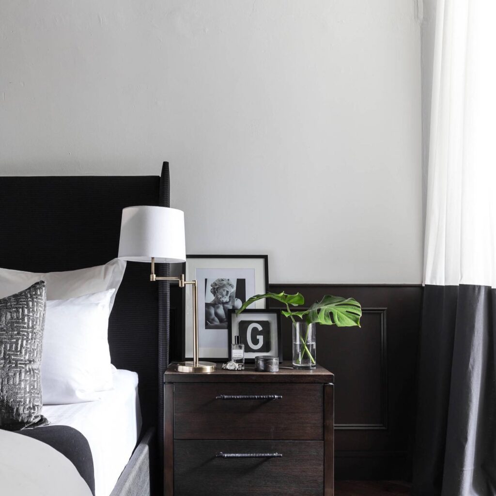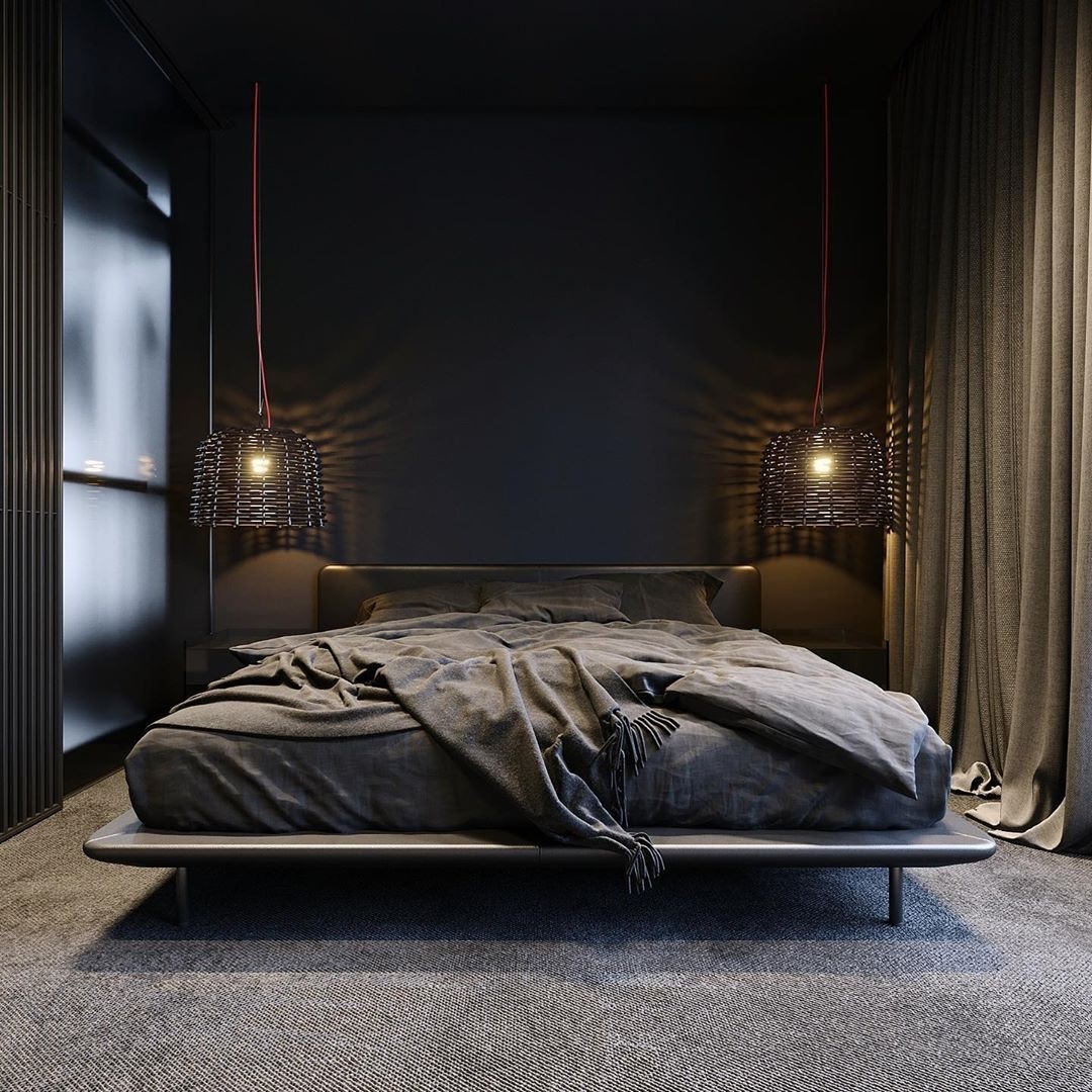 This bedroom captures the essence of dark sophistication with its minimalist design and moody palette. Deep charcoal walls and matching bedding create an immersive, cocoon-like atmosphere, while the woven pendant lamps introduce a warm, diffused glow that softens the darkness. The subtle red cords add a hint of contrast and personality without breaking the room’s calm rhythm.
