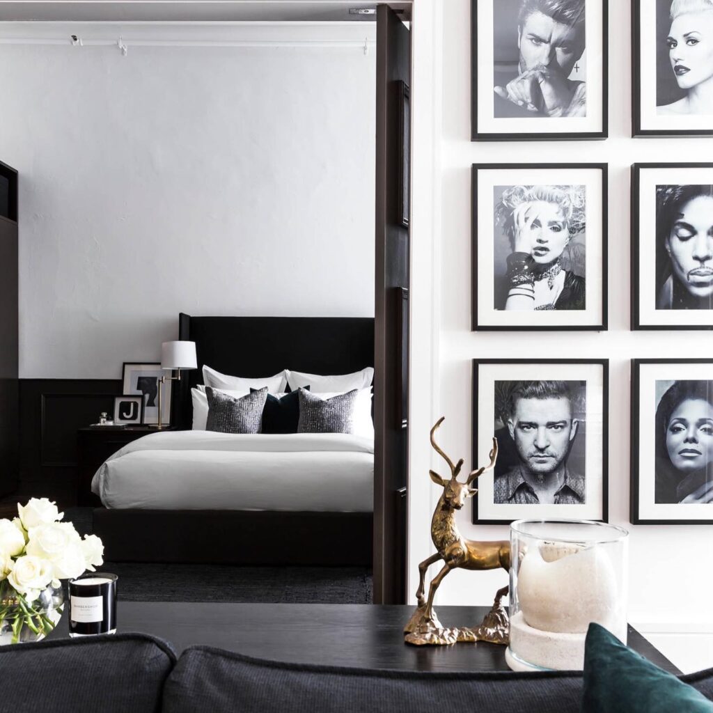 This bedroom showcases a laid-back yet stylish approach to modern minimalism. The white walls and light carpet keep the space airy and open, while the low, unframed bed and simple striped bedding create an effortless, relaxed vibe. A gallery wall filled with personal photos and framed prints adds character and individuality, giving the room a distinctly masculine yet personal touch.