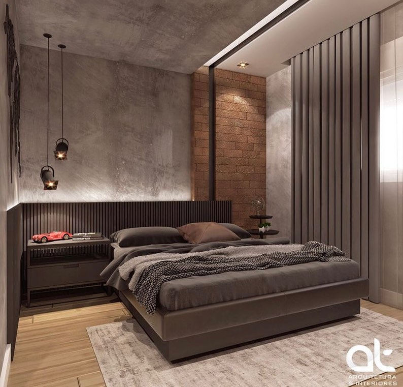 This bedroom redefines masculine sophistication through its industrial-inspired design. The raw concrete walls and ceiling create a bold, architectural backdrop, softened by layered bedding in shades of gray and taupe. A sleek, low-profile bed anchors the space, while the mix of textures—from the ribbed headboard to the cozy knit blanket—adds warmth and tactility.