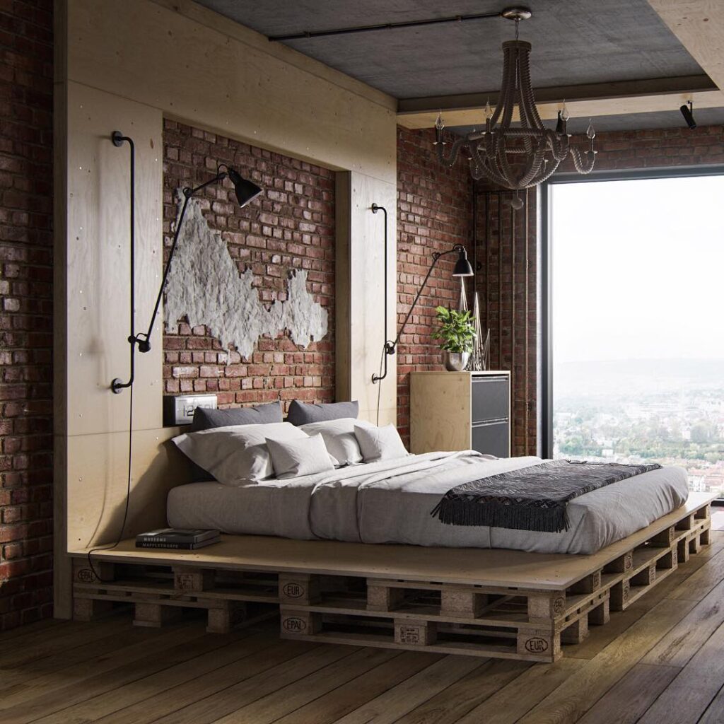 This bedroom captures the raw, rugged charm of industrial design with a distinctly masculine edge. Exposed brick walls and reclaimed wood elements set the tone, while the bed—crafted from stacked wooden pallets—anchors the space with a creative, sustainable touch. The mix of neutral gray bedding and soft lighting keeps the look warm and inviting despite the room’s bold architectural features.
