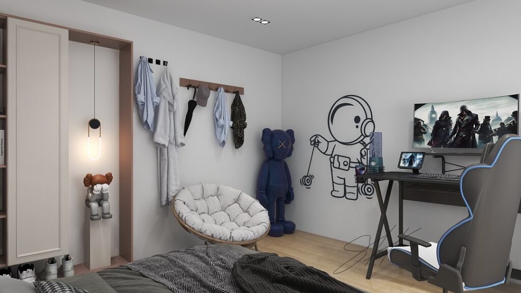 This room blends playfulness and sleek design, creating a modern setup perfect for gamers and creatives alike. The white walls and light wood flooring keep the space bright and clean, while the black gaming desk and ergonomic chair add a bold, high-tech edge. A wall decal of an astronaut adds character, reflecting a youthful, imaginative spirit.