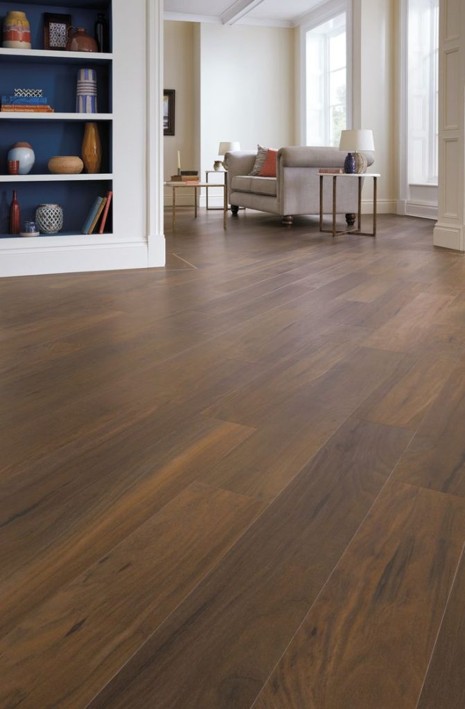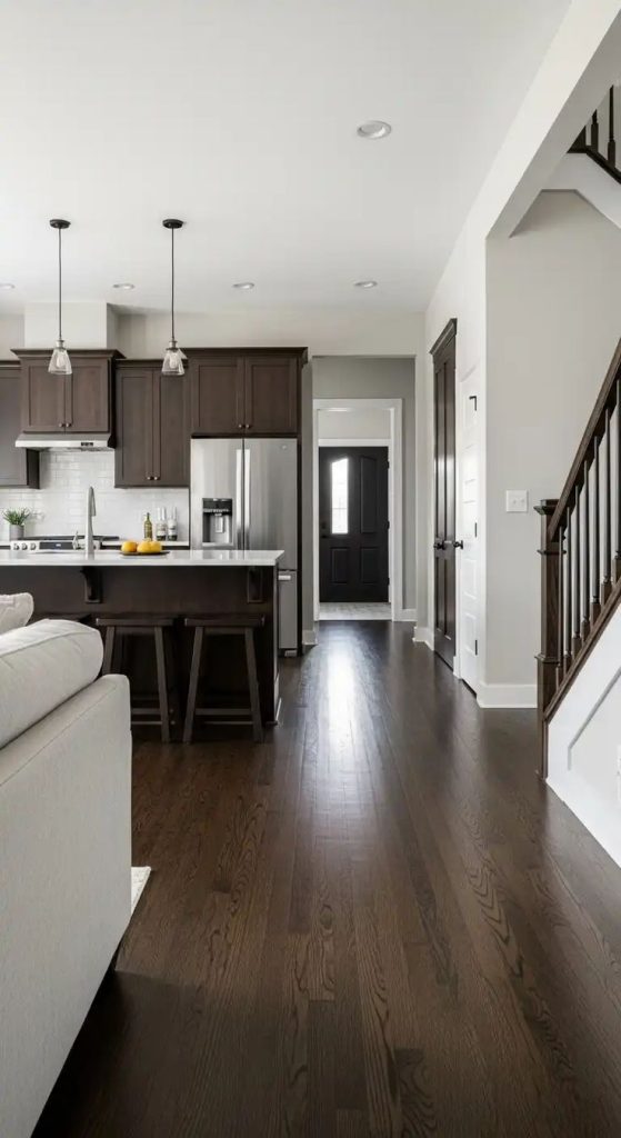 Deep, chocolate-brown walnut tones convey elegance and sophistication. Dark LVP hides dirt well and creates a dramatic contrast against light walls and furniture.