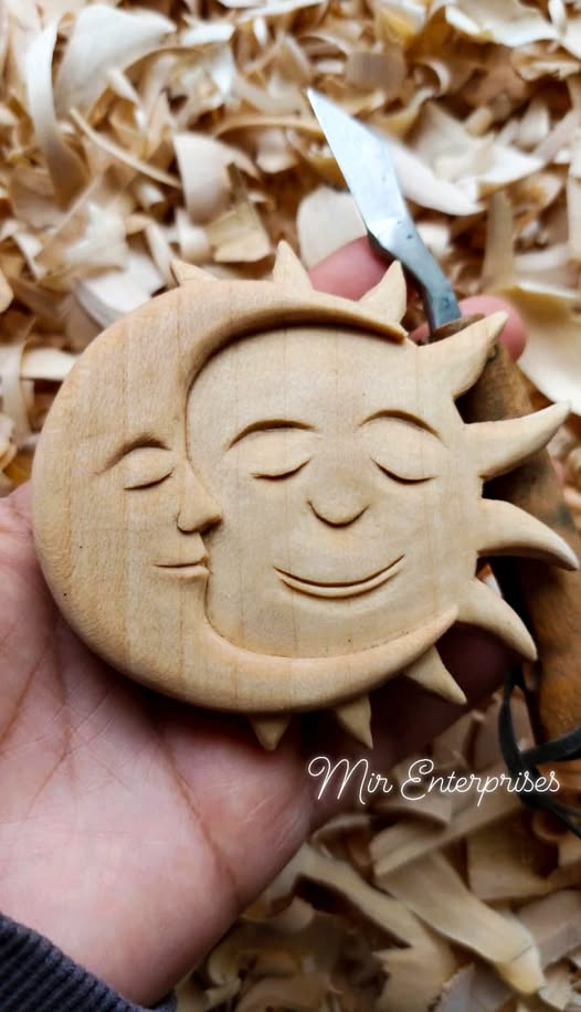 This flat relief design combines moon and sun imagery into a single balanced piece. Although it looks intricate, the carving itself relies more on clean outlines and smooth transitions than deep carving.