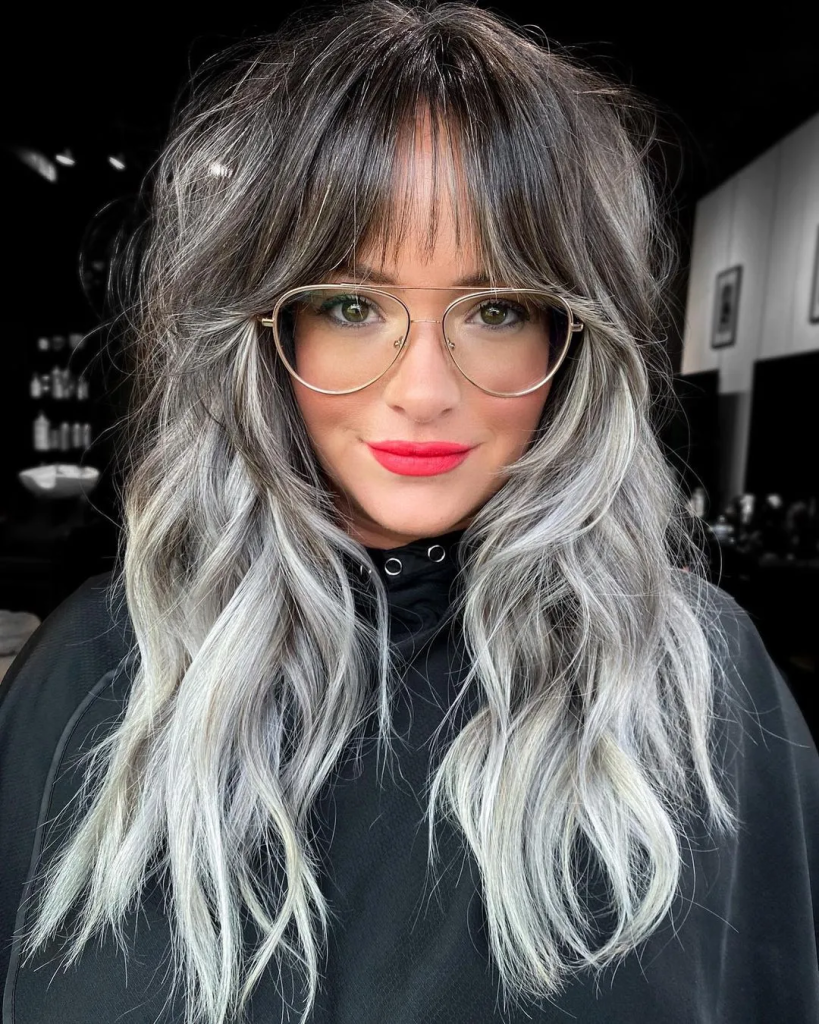 Why it works: Balayage is a hand-painted highlighting technique that creates a soft, graduated effect from darker roots to lighter ends. On dark hair (brown, black, or very dark gray), painting gray or silver through the mid-lengths and ends creates a stunning, high-fashion look. The dark roots mean you can go much longer between touch-ups.