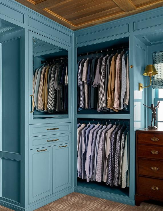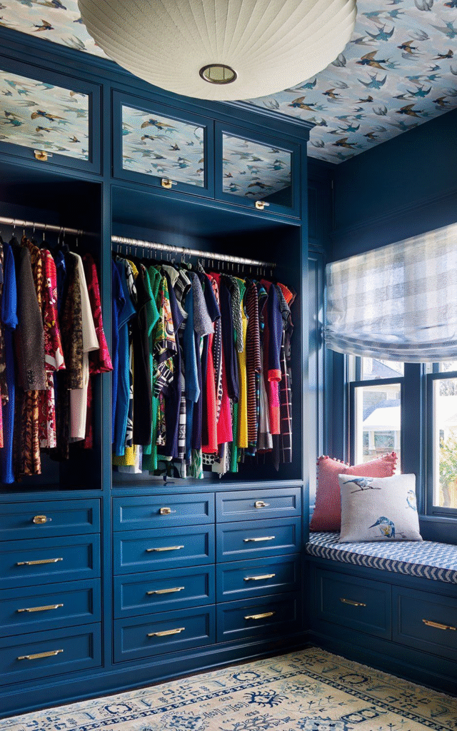 Blue is a surprisingly versatile choice for closets, instantly giving a space a curated, boutique-like feel. From soft powder blues to deep navy cabinetry, this color elevates storage areas while maintaining a calm and sophisticated atmosphere. Paired with brass hardware, warm wood accents, and thoughtful lighting, a blue closet becomes a space where organization and style coexist seamlessly.