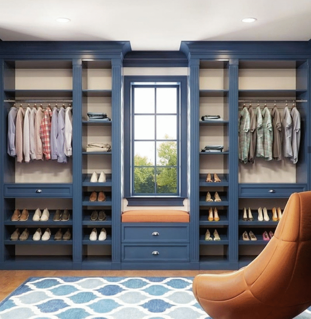 This closet offers an exciting, functional twist with deep blue cabinetry and a touch of vibrant personality. Open shelving along the right side creates easy access for shoes and accessories, while the spacious hanging area neatly organizes a colorful wardrobe of dresses and blouses. The blue tone of the walls and cabinetry creates a calm, cohesive look that complements the natural light flooding through the window. The closet’s clean lines are softened by the warm wooden floor and the cozy built-in seat beneath the window, making it a perfectly balanced and visually engaging space for both storage and style.