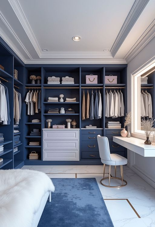 This luxurious blue closet space exudes timeless elegance, blending classic and modern design elements. The rich navy blue cabinetry is paired with gold hardware and an ornate chandelier, creating a sophisticated, upscale atmosphere. The mirror above the vanity area not only enhances the space but adds a touch of glamour. Glass-fronted shelves beautifully display fine accessories and clothing, while the soft, neutral rug ties everything together. The well-organized, functional layout ensures easy access to all wardrobe essentials while offering a sense of opulence and serenity.