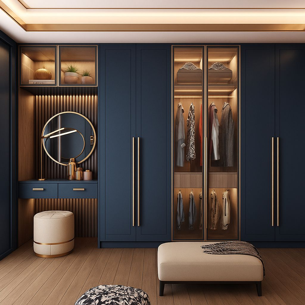 The image provided features a stunning, contemporary built-in wardrobe and dressing area defined by its deep navy blue cabinetry and luxurious gold accents. The overall design exudes a sense of sophisticated calm and modern elegance, a popular trend in 2025 interior design.
