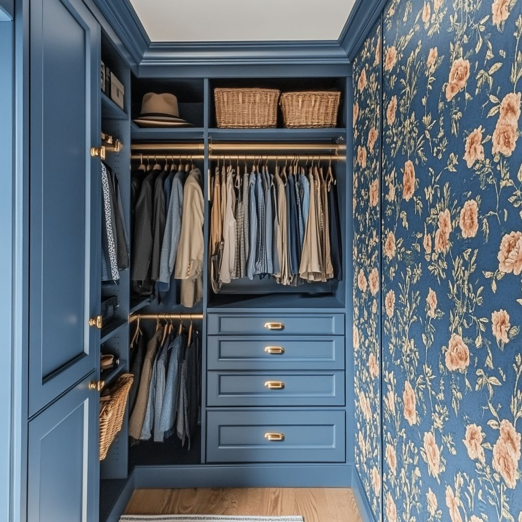 The image showcases a charming and efficient galley-style walk-in closet with a striking blend of solid color cabinetry and a bold, vintage-inspired floral wallpaper. The custom built-ins are painted in a sophisticated dusty blue or slate blue color, which covers the shelving, drawers, and trim work. This blue acts as a neutral backdrop that carries a range of tones.