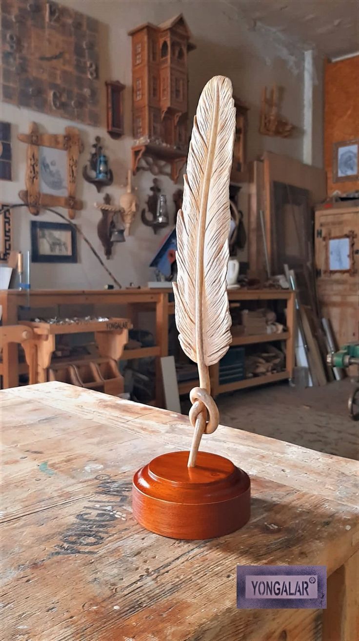 - Design Style: A tall, upright wooden feather featuring soft, rounded barbs and a prominent central quill, standing inside a small, square-based “inkwell”.