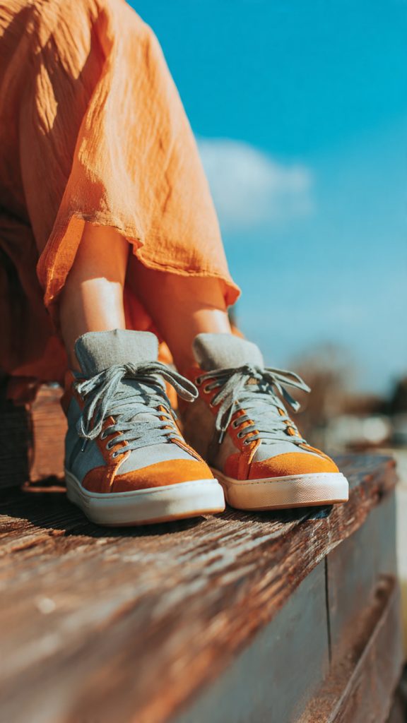 Close-up of teen girl’s sneakers, flats, or ankle boots styled with casual spring outfits, bright outdoor setting, lifestyle-focused