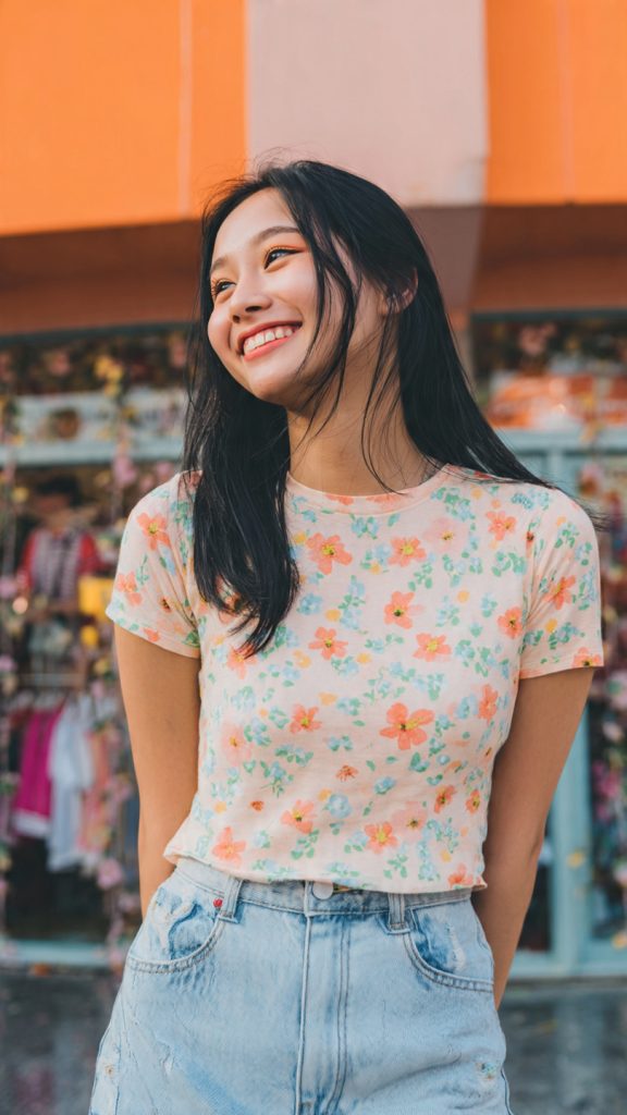 - Graphic tees, printed blouses, or simple pastel-colored t-shirts.
