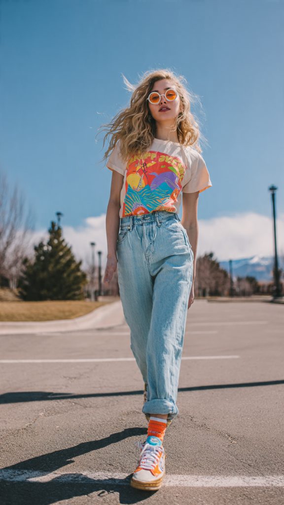 - High-waisted skinny, straight-leg, or relaxed-fit jeans paired with fun graphic tees.