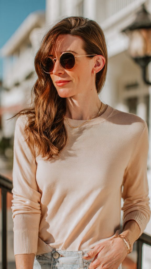 - Fine-gauge sweaters in pastel or neutral shades.