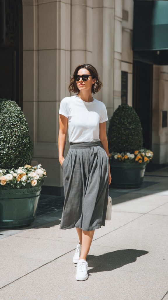 - A-line or pleated midi skirts paired with fitted tees or blouses.