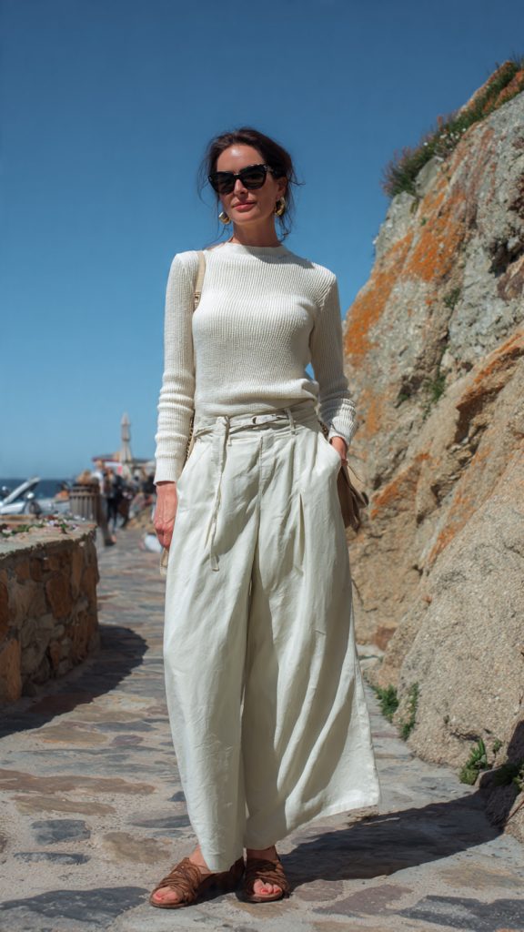 - Cropped sweaters over high-waisted trousers for modern styling.