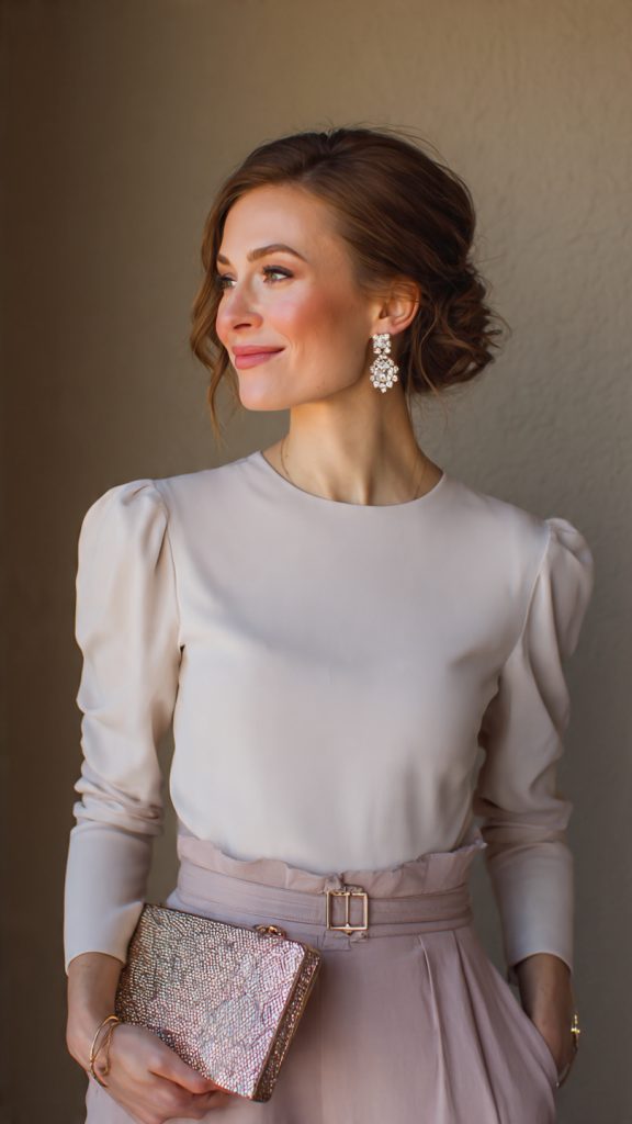 - Blouses with subtle details such as draping, lace, or statement sleeves