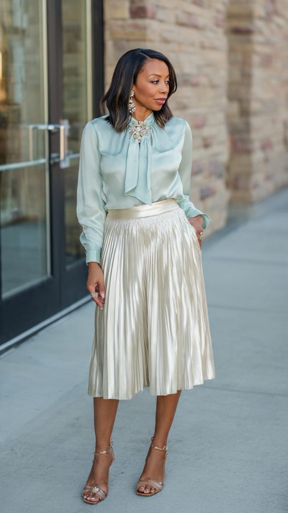 - Midi skirts in satin, chiffon, or pleated fabrics
