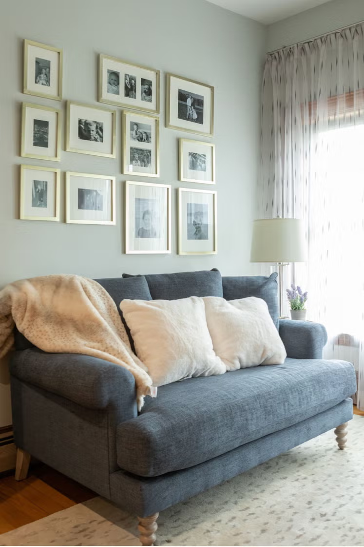This soft neutral gallery wall creates a serene and inviting focal point in this cozy living room corner. The light-toned frames add a subtle touch of elegance, allowing the black-and-white family photos to stand out beautifully against the gentle gray wall. Arranged in a balanced yet slightly staggered layout, the collection feels curated and personal without overwhelming the space. Paired with a plush loveseat, fluffy pillows, and soft natural light, this gallery wall brings warmth, personality, and a calming atmosphere to any home.