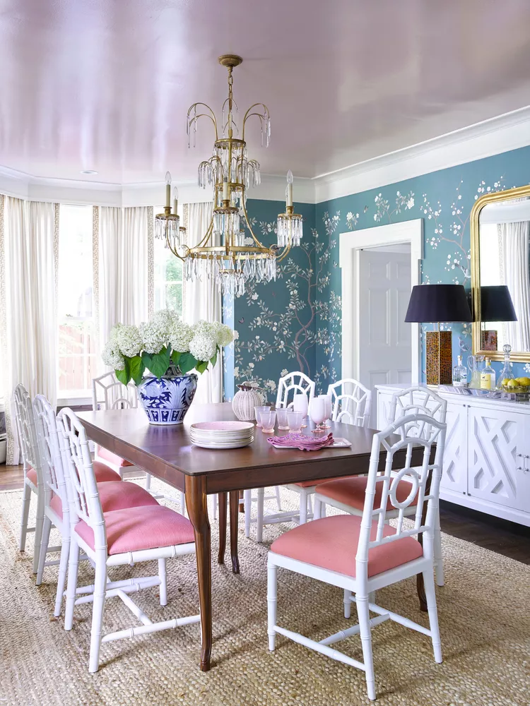 This dining room beautifully blends classic chinoiserie style with a fresh, feminine palette, creating a space that feels graceful, inviting, and visually rich. The hand-painted blue wallpaper becomes the star of the room, featuring delicate floral motifs that add a sense of artistry and timeless sophistication. Paired with crisp white trim and soft natural light, the walls set a serene yet vibrant backdrop.