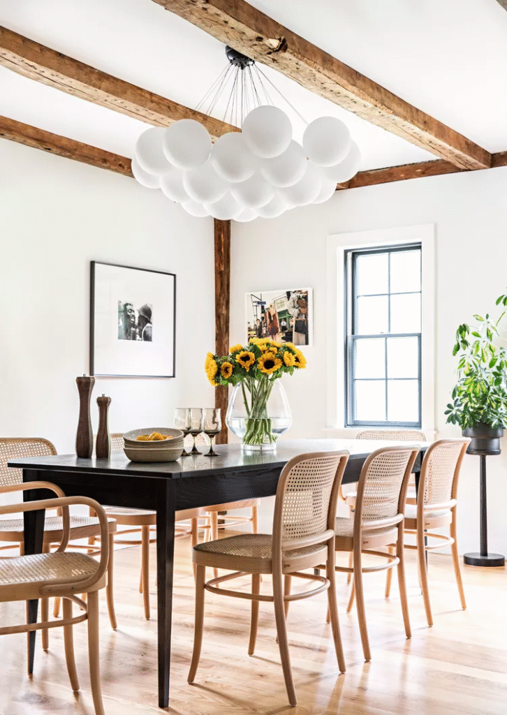 A sleek black dining table creates bold contrast, while the light wood cane-back chairs bring in organic tones that echo the flooring and ceiling beams. Sunflowers arranged in a clear glass vase add a lively burst of color, enhancing the room’s cheerful, welcoming feel. Artful black-framed wall décor and a lush potted plant complete the look, tying together a space that feels modern, fresh, and effortlessly inviting.