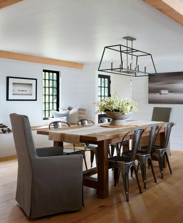 Shiplap walls, black-framed windows, and exposed ceiling beams enhance the farmhouse aesthetic while maintaining a bright, airy feel. A simple runner and a stone vessel filled with crisp white florals add understated elegance. Together, these elements create a harmonious, modern farmhouse dining room that feels both relaxed and elevated.