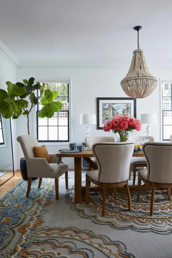 This formal dining room pairs timeless décor with inviting warmth, creating a space that feels both elevated and comfortable. The sculpted dining chairs, upholstered in a creamy fabric with nailhead detailing, surround a solid wood table that anchors the room with natural charm. A beaded chandelier introduces an artisanal touch, softening the look with its warm, organic texture. The richly patterned rug adds movement and color, echoing the fresh floral centerpiece that brings a lively pop of pink to the table. Large windows frame the room in natural light, while a tall fiddle-leaf fig and thoughtfully placed artwork complete the balanced blend of classic sophistication and modern freshness.