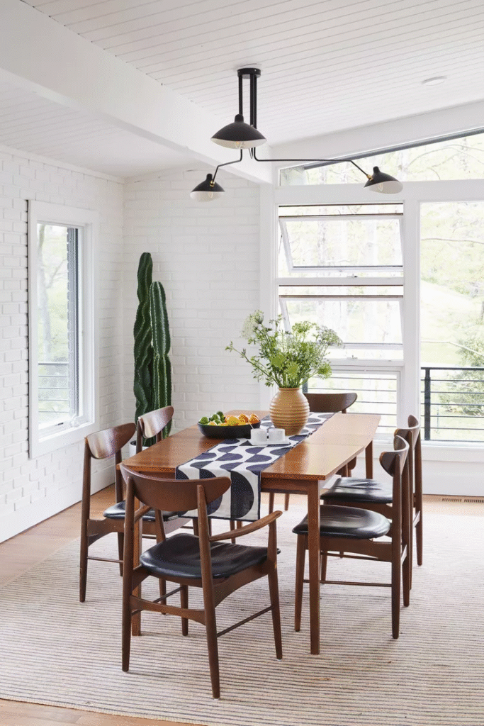 This dining room blends mid-century warmth with fresh minimalism, creating a clean yet inviting setting. The sleek wooden table and sculptural dining chairs introduce classic mid-century lines, while the black leather seats add a subtle touch of refinement. Crisp white brick walls and expansive windows flood the space with natural light, enhancing the room’s bright and open feel. A simple patterned table runner and a vase filled with leafy greens bring organic texture and visual interest without overwhelming the minimalist aesthetic. Anchored by a neutral striped rug and accented with modern black lighting, this dining room offers a perfectly balanced fusion of simplicity, style, and timeless design.