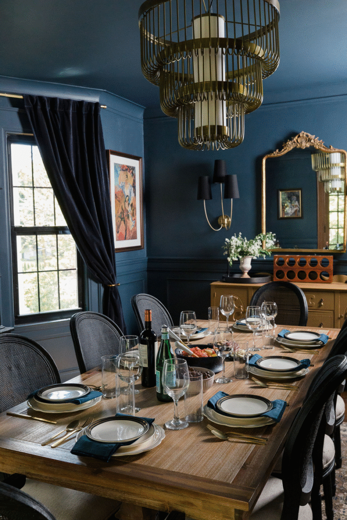 This formal dining room embraces a rich, moody palette with deep blue walls, ceiling, and drapery that create an enveloping sense of sophistication. The standout feature is the sculptural brass chandelier, whose layered, cage-like design introduces striking modern drama while casting warm, ambient light. Paired with elegant black-upholstered chairs and a natural wood table, the space achieves a seamless blend of contemporary style and classic refinement. Gold-toned accents—from cutlery to the ornate mirror frame—add subtle luxury, while curated artwork and fresh greenery bring a personalized, curated touch to this intimate, atmospheric setting.