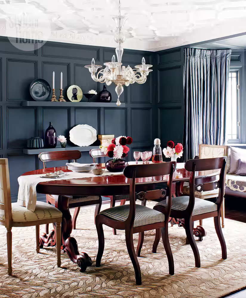 This formal dining room pairs historic charm with refined sophistication through its deep, paneled walls painted in a rich midnight hue. The glossy mahogany dining table and carved chairs add a timeless, heirloom feel, while the patterned upholstered seats introduce subtle softness. Overhead, a delicate glass chandelier brings graceful illumination that complements the room’s traditional character. The textured area rug warms the space, and the decorative shelf—styled with ceramics, candles, and curated accents—adds depth without overwhelming the design. Luxurious drapery and fresh floral arrangements complete the look, creating a romantic and polished dining environment perfect for intimate gatherings.