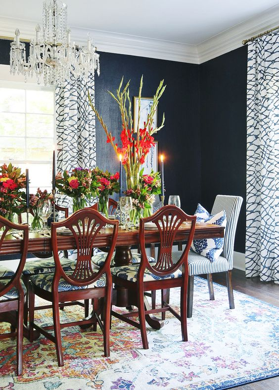 A floral rug in lively hues ties the palette together, adding warmth and visual dimension beneath the dark-toned table. The arrangement of vivid flowers in the center of the table enhances the vibrancy of the room, echoing the rich colors found in the rug and décor. Striped accent chairs and graphic-patterned curtains bring in contemporary contrast, giving the space personality and layered style. The result is a dining room that feels both classic and refreshingly bold, perfect for those who love color and refined elegance.