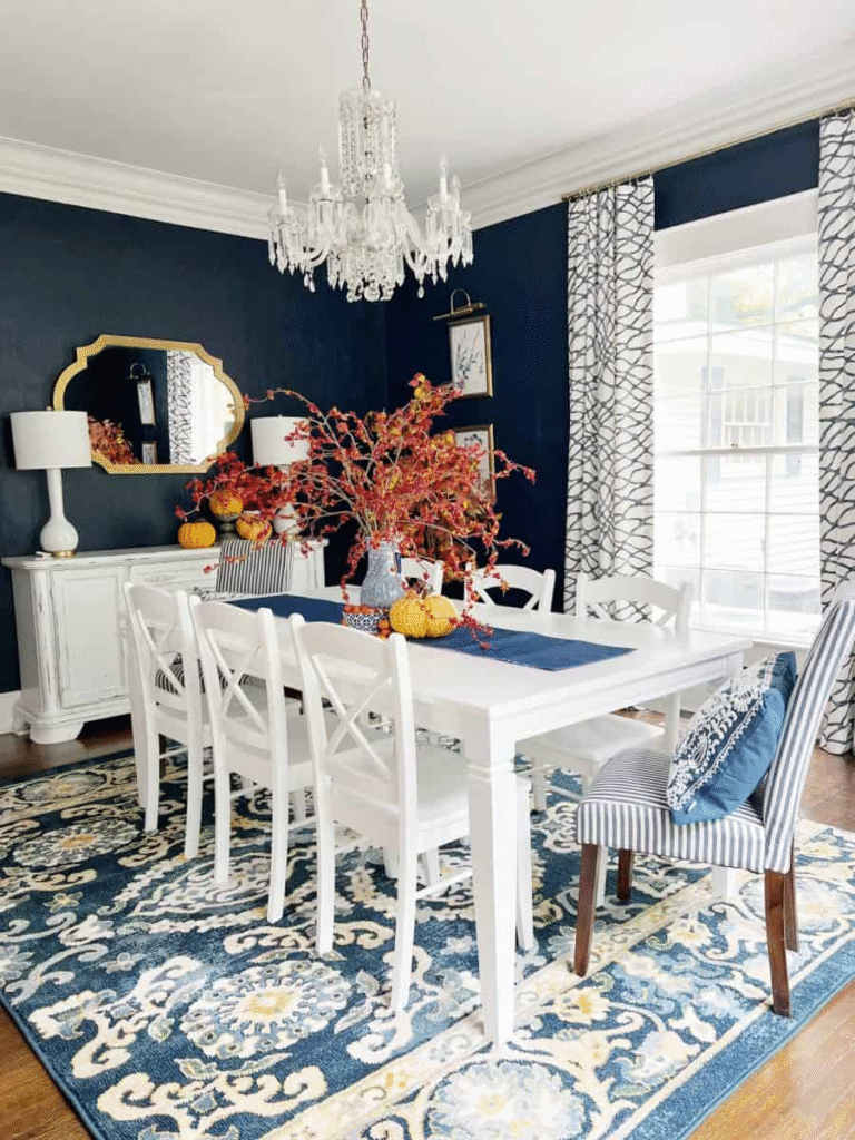 This formal dining room blends timeless navy walls with crisp white furniture to create a fresh, balanced, and refined aesthetic. A sparkling crystal chandelier anchors the space with an air of sophistication, while the patterned curtains and ornate area rug echo the room’s rich blue palette. The white dining table and chairs introduce a clean contrast, making the centerpiece of autumnal foliage and mini pumpkins stand out beautifully. Gold-framed mirrors and table lamps add a warm, traditional touch, bringing depth and soft illumination that enhances the room’s polished charm.