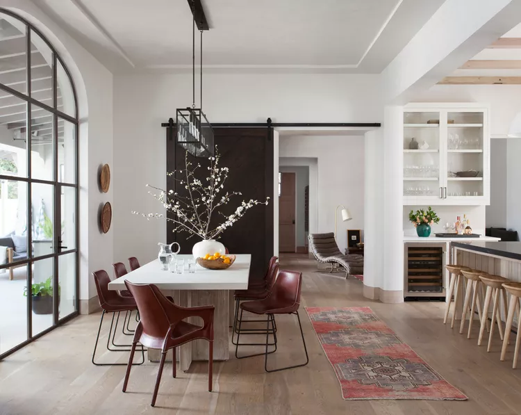 A contemporary rectangular pendant light hangs above, echoing the dark metal accents found throughout the room—most notably in the striking black sliding barn door and the large steel-framed arched window. Natural light pours in generously, brightening the neutral palette and highlighting the warm wood flooring.