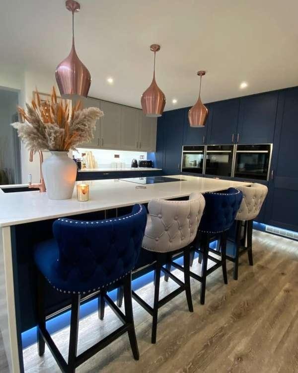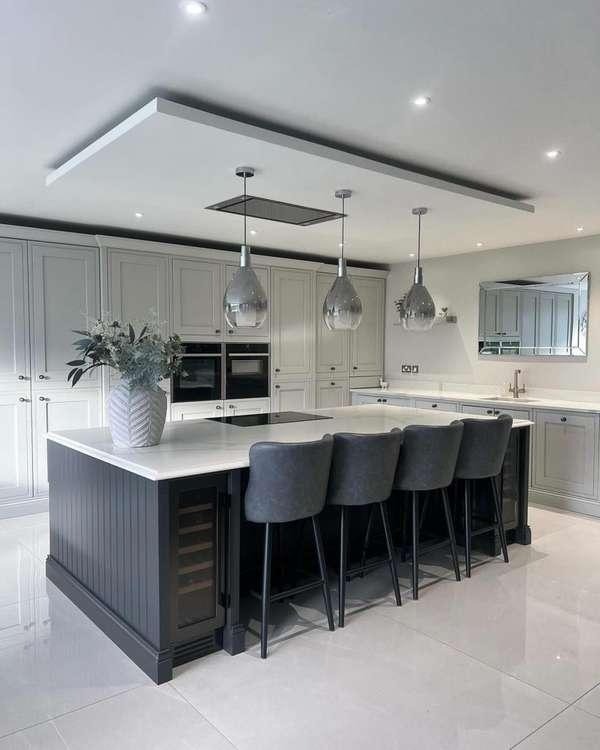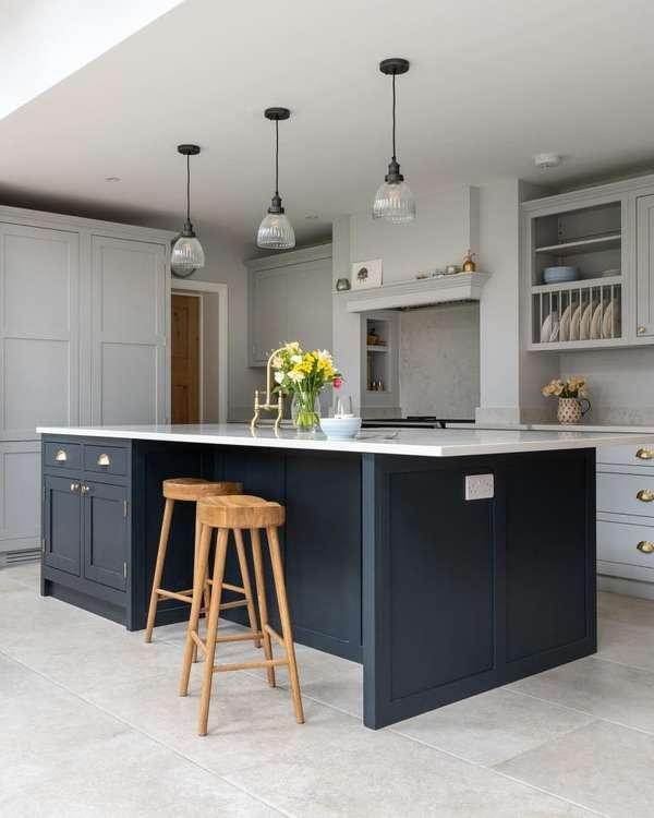 A dark navy or charcoal island surrounded by light, neutral cabinetry creates an instant focal point in an open-plan kitchen. What makes this design work is the triple pendant drop directly above the island — pendants hung 30–36 inches above the counter surface both light the workspace and signal to the eye exactly where the room’s center of gravity is. The contrast between the deep island base and white stone top keeps the look sophisticated rather than heavy.