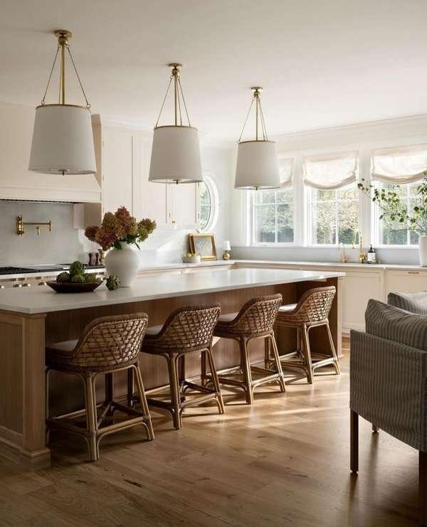 Pendants above an island do two things simultaneously: provide task lighting directly where you work, and introduce a sculptural element at eye level that the room was missing. The rules: hang pendants 30–36 inches above the countertop surface, space them 24–30 inches apart, and use an odd number over a long island (three over 5–6 feet, five over 8+ feet). Always wire pendants on a dimmer for full control between bright task light during cooking and warm ambient light during dinner.