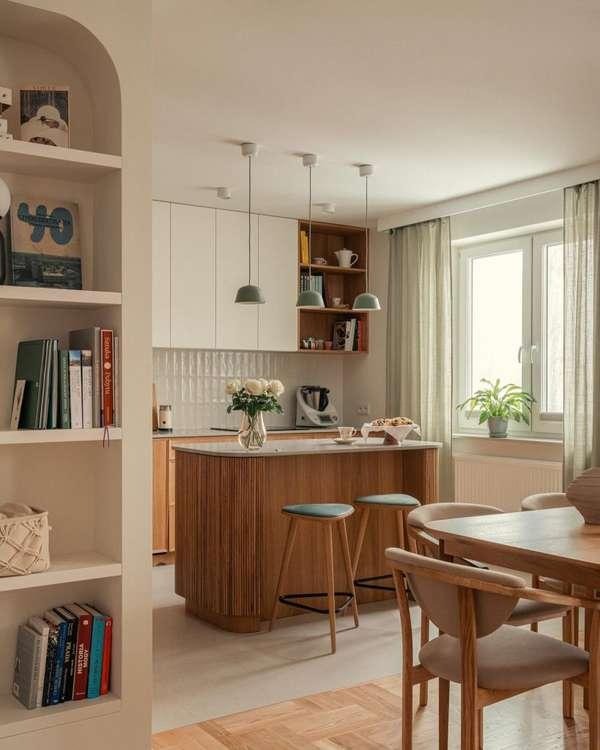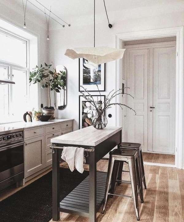 A narrow 24-inch-deep island adds meaningful prep space and storage in kitchens that can’t accommodate a full-width island. At this depth it’s best suited purely for prep and storage — no cooktop, no sink — and works beautifully as an opposite-wall anchor in a galley configuration, turning a two-wall layout into something closer to a U-shape. The Scandinavian approach pairs this with clean-lined cabinetry and warm wood accents for a result that feels effortlessly composed.