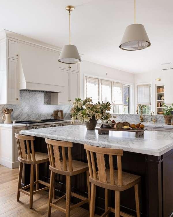 Natural marble brings movement and depth that no engineered stone fully replicates. This design pairs a heavily veined marble slab with a dark stained island base and warm oak dining chairs for a combination that reads as both classic and contemporary. The generous seating overhang — at least 15 inches for comfortable knee clearance — turns the island into a full dining destination. Specify honed rather than polished marble on a working island; it hides the inevitable daily wear far better.